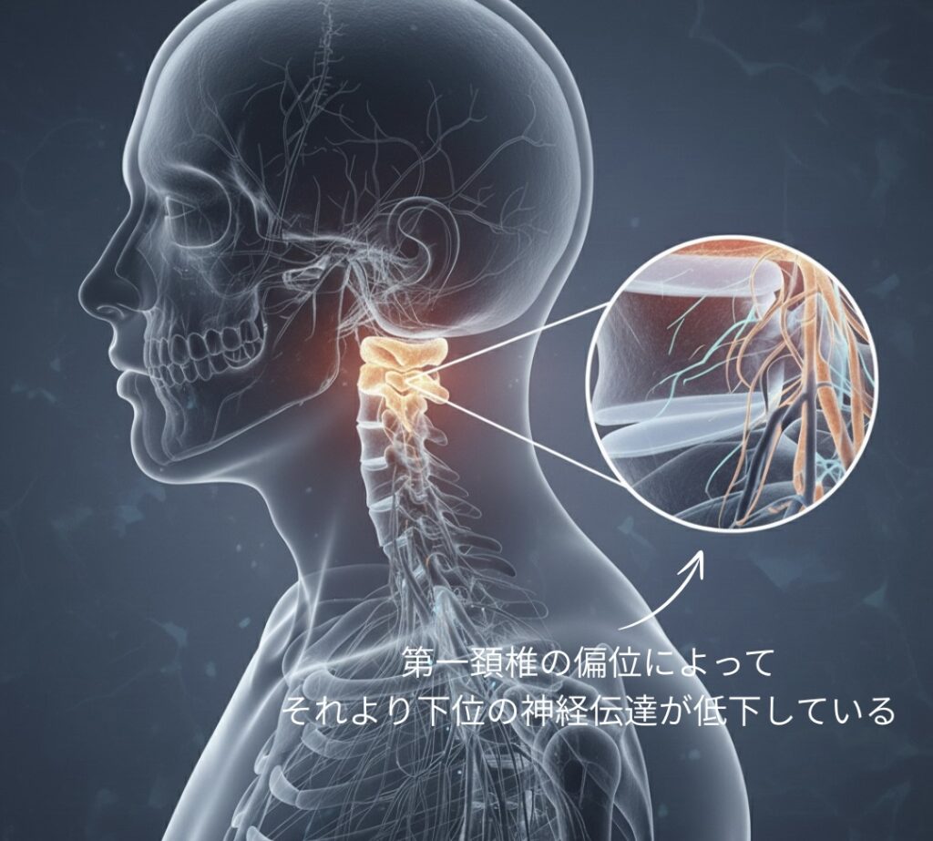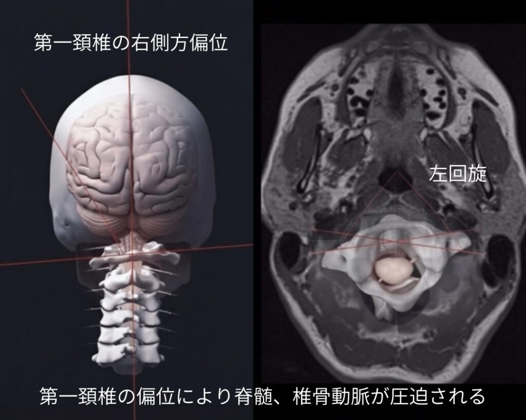 今回のケースは第1頚椎という首の1番上にある椎体が左回旋、右側方偏位、そして後方偏位していました。それにより首から下の筋肉に運動指令がうまく届かなくなり、力が入らない、体重を支えきれずふわふわするといった症状が現れていました。
