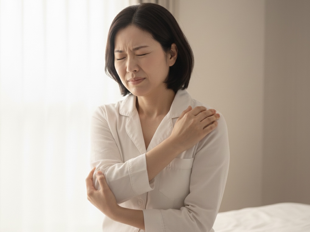 左の肘内側と手に痛みがあり、特に朝起きた時にこわばりや痛みを強く感じる50代女性の症例です。