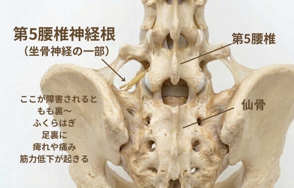 図にあるように第5腰椎と仙骨の間には坐骨神経の一部が通っています。
