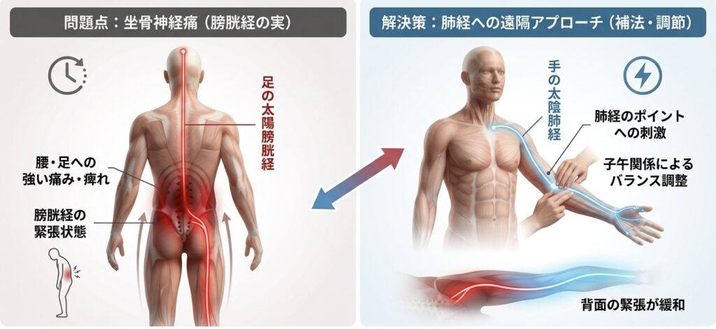 本症例における坐骨神経痛は経絡のラインで説明すると膀胱経と呼ばれるラインになります。